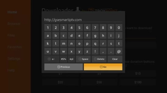 9. Enter the GSE Smart IPTV APK link and hit the Go button.