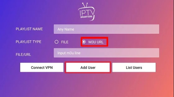 9. If you choose the option Load Your Playlist or File/URL, enter the Playlist Name, Type, M3U URL link, and click Add User.