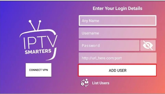10. If you have selected the option Login with Xtream Codes API, enter the Playlist name, Username, Password, Server Port URL, and tap Add User.